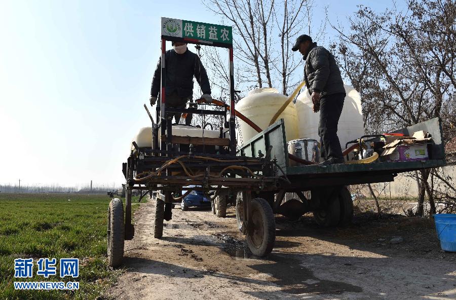 3月11日,在山东省桓台县,政府出资购买农机服务和药物、肥料,为麦田进行春季病害防控施肥施药。随着天气转暖,山东省小麦主产区之一的桓台县35万亩小麦进入春季护理关键期。该县拨出专项资金,为全县麦农免费提供用于小麦防控纹枯病、根腐病和抵御倒春寒危害的药物和肥料。政府还出资向农机合作社购买农机服务,为适合机械化喷洒的麦田提供免费农机服务。预计3月底前,全县所有麦田都能完成春季病害防控施肥施药工作。新华社记者 徐速绘 摄
