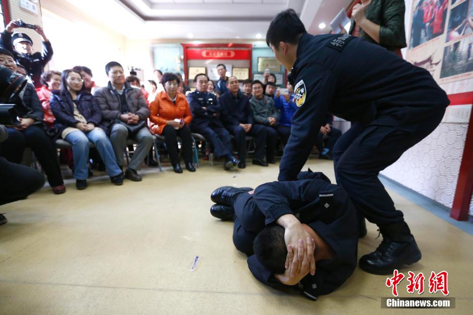 3月11日,“做自己的首席安全官”公共安全防范宣传活动,在北京西城区义达里社区拉开了序幕。活动以舞台话剧、互动问答、现场演示等形式,围绕北京、张家口申办2022年冬季奥运会、社区居民安全防范、大型活动注意事项和防踩踏等突发事件应对,教授民众人人“做自己的首席安全官”,在提升自身安防技能、技巧的同时,共同分享国家申办冬奥会的激情与快乐。图为特警演示跌倒时如何自我防范。中新社发 富田 摄