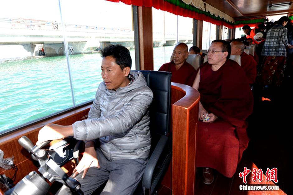 3月12日消息,近日,一艘藏式游览船现身拉萨河,是拉萨河上的第一艘观光游览船,目前正在试运行阶段。据了解,为了保护拉萨河的生态环境,该游览船特别采用了液化气作为动力驱动,不会污染河水。游览船将于5月1日正式对外开放,届时国内外游客皆可乘船赏拉萨河两岸风景。李林 摄