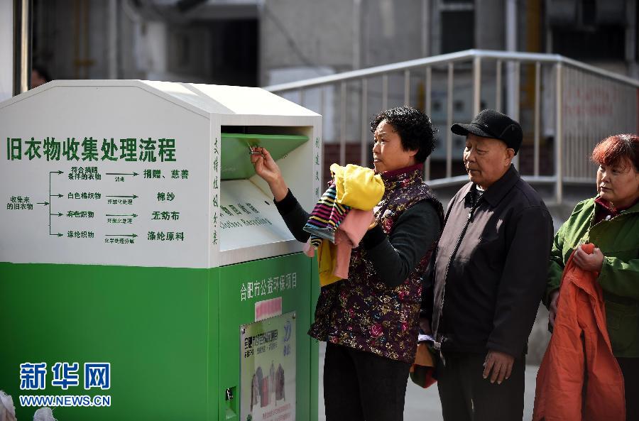 3月12日,合肥市瑶海区三里街街道凤阳一村社区居民将旧衣物投放到“旧衣宝”中。近日,合肥市瑶海区三里街街道联合一家公益环保企业在辖区社区内放置旧衣物回收箱“旧衣宝”,收集辖区居民捐赠的旧衣物,并对废旧衣物进行分类处理。据悉,该款“旧衣宝”高1.7米,宽1.2米,一次最多能容纳70斤衣物。新华社发(解琛 摄)