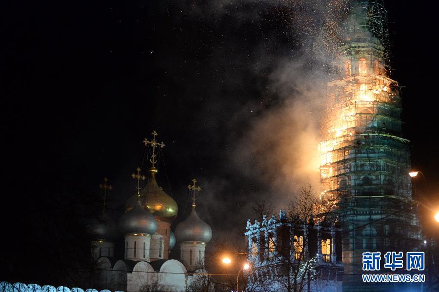 3月15日,在俄罗斯莫斯科,新圣女修道院燃起大火。俄罗斯首都莫斯科紧急情况总局15日发布消息说,位于莫斯科中心城区的世界文化遗产新圣女修道院当晚发生火灾,目前尚无人员伤亡报道。新华社发(别德尼亚科夫摄)