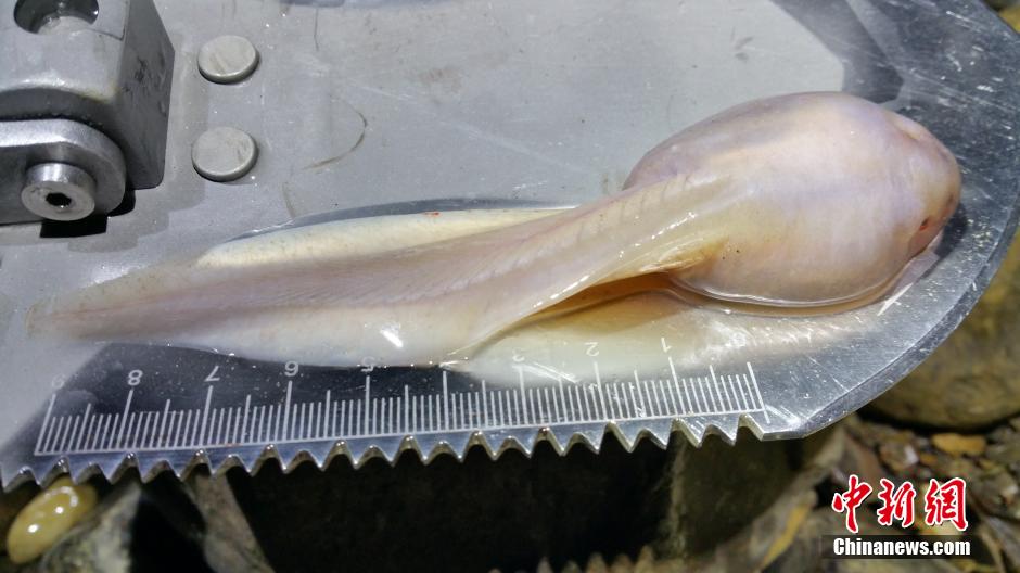 3月14日,遵义洞穴探险金牛队队员,在遵义城郊一处海拔约780米的洞内溪流中,发现一只体长14厘米的巨型蝌蚪。经从事洞穴生物研究多年的贵州省洞穴协会秘书长钱治查证,这只巨型蝌蚪是红点齿蟾的幼体。红点齿蟾幼体蝌蚪个头较大,但长达14厘米的幼体实属罕见。红点齿蟾为稀有两栖动物,该物种主要分布于海拔1000-1790米的石灰岩洞穴及周边地带,《中国物种红色名录》将其列为易危物种。红点齿蟾幼体大多栖于石灰岩溶洞内的溪流中,在洞内长期无光条件下生活,皮肤颜色透明,内部器官清晰可见,也叫棒头鱼或透明鱼。如将它置于光亮处饲养,体色渐深,呈紫色发展,内脏不易看清。中新社发 曾学浩 摄