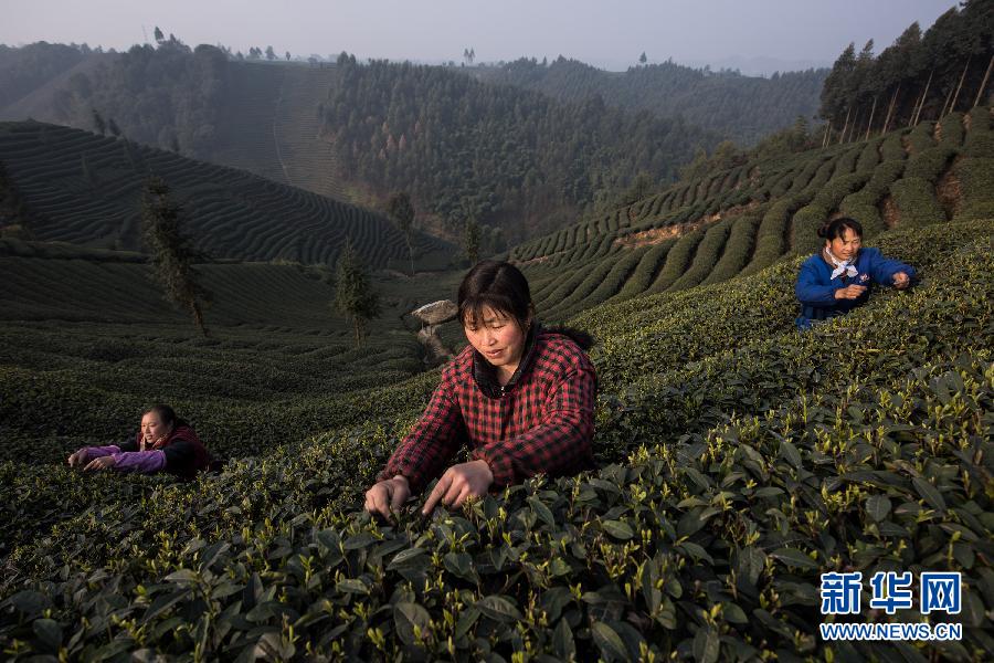 在雅安市名山区中峰乡,几位茶农在采明前茶(3月13日摄)。 “扬子江心水,蒙山顶上茶”,颂赞的是四川省雅安市名山区境内的蒙顶山茶。每年清明节前,蒙顶山四周整齐的茶垄成行成排。每天清晨,茶垄里就有了勤快的采茶人,腰间挎着小竹笼,双手翻飞,灵巧地采摘嫩茶。早晨和中午时分,在名山区双河、黑茅等茶叶交易市场人山人海,几十万斤鲜茶涌入市场,众多茶商忙着讨价还价,一般清明节前交易额都会达到20多亿元。截至2014年底,名山区拥有茶园面积33.2万亩,农民人均拥有茶园面积1.38亩,茶叶产量产值、良种化率、机械化率、茶苗繁育等指标均名列全国前茅,现拥有1000多家茶叶加工企业,茶叶综合产值40余亿元。雅安市名山区在芦山地震中众多茶企和茶园受损。在近两年的灾后恢复重建中,当地政府围绕茶叶、生态、文化、旅游四大优势特色资源,科学重建。如今的名山,吸引着大批外地茶商和游客前来购茶、观光。新华社记者 江宏景摄