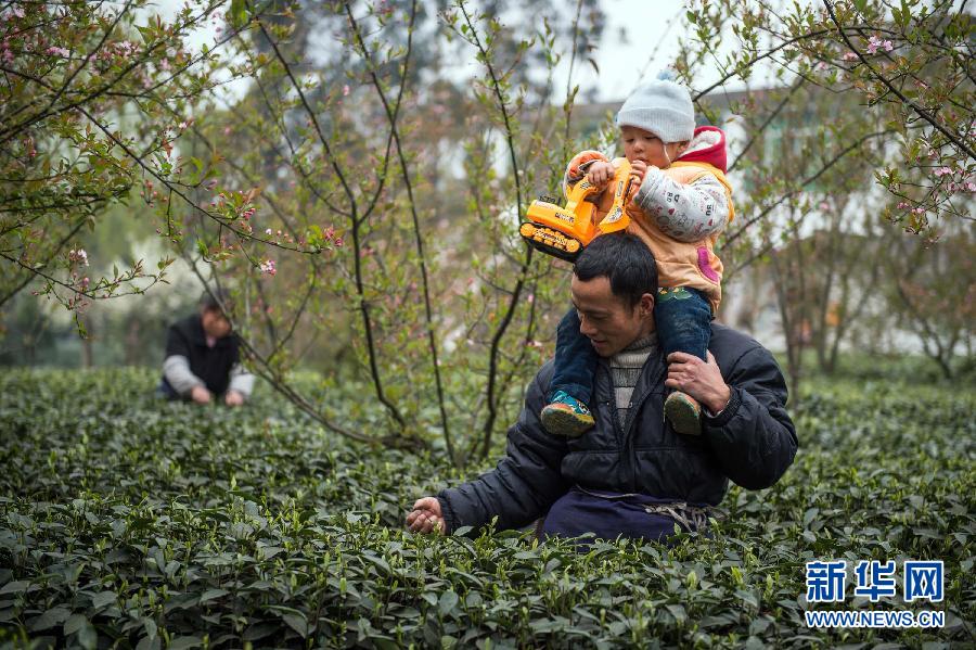 在雅安市名山区双河乡上马村,茶农蒋文勇背着孩子采茶(3月12日摄)。 “扬子江心水,蒙山顶上茶”,颂赞的是四川省雅安市名山区境内的蒙顶山茶。每年清明节前,蒙顶山四周整齐的茶垄成行成排。每天清晨,茶垄里就有了勤快的采茶人,腰间挎着小竹笼,双手翻飞,灵巧地采摘嫩茶。早晨和中午时分,在名山区双河、黑茅等茶叶交易市场人山人海,几十万斤鲜茶涌入市场,众多茶商忙着讨价还价,一般清明节前交易额都会达到20多亿元。截至2014年底,名山区拥有茶园面积33.2万亩,农民人均拥有茶园面积1.38亩,茶叶产量产值、良种化率、机械化率、茶苗繁育等指标均名列全国前茅,现拥有1000多家茶叶加工企业,茶叶综合产值40余亿元。雅安市名山区在芦山地震中众多茶企和茶园受损。在近两年的灾后恢复重建中,当地政府围绕茶叶、生态、文化、旅游四大优势特色资源,科学重建。如今的名山,吸引着大批外地茶商和游客前来购茶、观光。新华社记者 江宏景摄