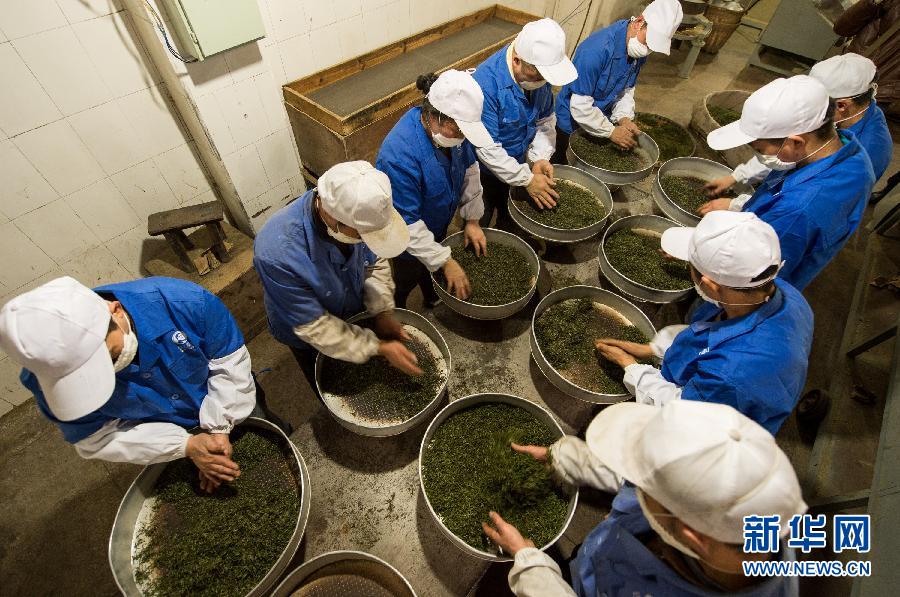 3月15日,在雅安市名山区跃华茶叶公司生产车间,工人在手工制作蒙顶甘露。 “扬子江心水,蒙山顶上茶”,颂赞的是四川省雅安市名山区境内的蒙顶山茶。每年清明节前,蒙顶山四周整齐的茶垄成行成排。每天清晨,茶垄里就有了勤快的采茶人,腰间挎着小竹笼,双手翻飞,灵巧地采摘嫩茶。早晨和中午时分,在名山区双河、黑茅等茶叶交易市场人山人海,几十万斤鲜茶涌入市场,众多茶商忙着讨价还价,一般清明节前交易额都会达到20多亿元。截至2014年底,名山区拥有茶园面积33.2万亩,农民人均拥有茶园面积1.38亩,茶叶产量产值、良种化率、机械化率、茶苗繁育等指标均名列全国前茅,现拥有1000多家茶叶加工企业,茶叶综合产值40余亿元。雅安市名山区在芦山地震中众多茶企和茶园受损。在近两年的灾后恢复重建中,当地政府围绕茶叶、生态、文化、旅游四大优势特色资源,科学重建。如今的名山,吸引着大批外地茶商和游客前来购茶、观光。新华社记者 江宏景摄