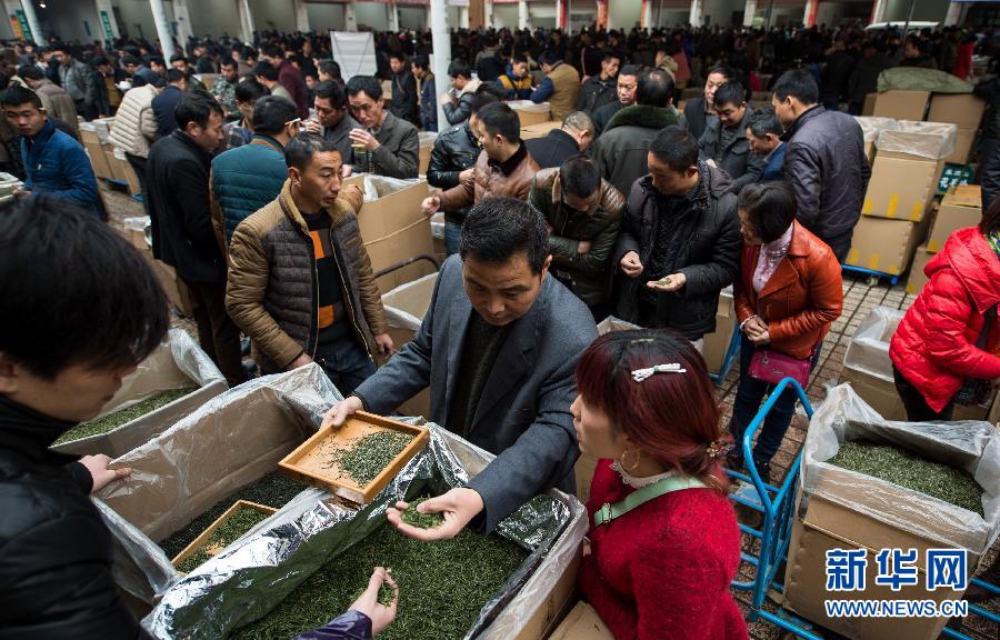 3月15日,茶商在雅安市名山区茶叶交易市场选购成品茶叶。 “扬子江心水,蒙山顶上茶”,颂赞的是四川省雅安市名山区境内的蒙顶山茶。每年清明节前,蒙顶山四周整齐的茶垄成行成排。每天清晨,茶垄里就有了勤快的采茶人,腰间挎着小竹笼,双手翻飞,灵巧地采摘嫩茶。早晨和中午时分,在名山区双河、黑茅等茶叶交易市场人山人海,几十万斤鲜茶涌入市场,众多茶商忙着讨价还价,一般清明节前交易额都会达到20多亿元。截至2014年底,名山区拥有茶园面积33.2万亩,农民人均拥有茶园面积1.38亩,茶叶产量产值、良种化率、机械化率、茶苗繁育等指标均名列全国前茅,现拥有1000多家茶叶加工企业,茶叶综合产值40余亿元。雅安市名山区在芦山地震中众多茶企和茶园受损。在近两年的灾后恢复重建中,当地政府围绕茶叶、生态、文化、旅游四大优势特色资源,科学重建。如今的名山,吸引着大批外地茶商和游客前来购茶、观光。新华社记者 江宏景摄