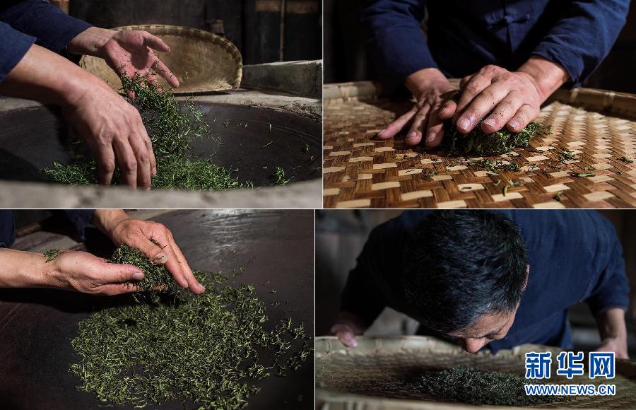 3月15日,雅安市名山区蒙顶甘露手工制茶传承人张跃华在手工制作蒙顶甘露(拼版照片)。 “扬子江心水,蒙山顶上茶”,颂赞的是四川省雅安市名山区境内的蒙顶山茶。每年清明节前,蒙顶山四周整齐的茶垄成行成排。每天清晨,茶垄里就有了勤快的采茶人,腰间挎着小竹笼,双手翻飞,灵巧地采摘嫩茶。早晨和中午时分,在名山区双河、黑茅等茶叶交易市场人山人海,几十万斤鲜茶涌入市场,众多茶商忙着讨价还价,一般清明节前交易额都会达到20多亿元。截至2014年底,名山区拥有茶园面积33.2万亩,农民人均拥有茶园面积1.38亩,茶叶产量产值、良种化率、机械化率、茶苗繁育等指标均名列全国前茅,现拥有1000多家茶叶加工企业,茶叶综合产值40余亿元。雅安市名山区在芦山地震中众多茶企和茶园受损。在近两年的灾后恢复重建中,当地政府围绕茶叶、生态、文化、旅游四大优势特色资源,科学重建。如今的名山,吸引着大批外地茶商和游客前来购茶、观光。新华社记者 江宏景摄