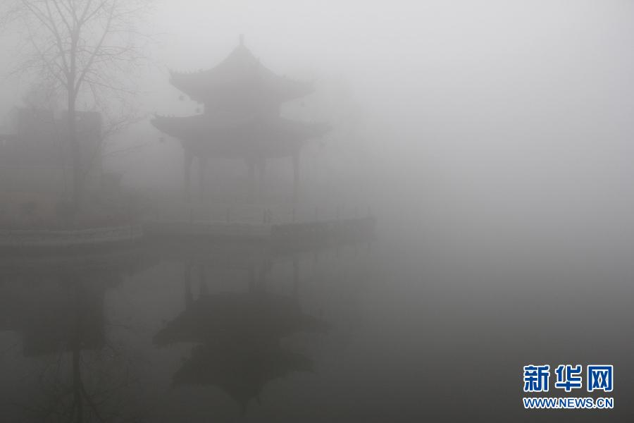 3月16日清晨拍摄的浓雾笼罩下的山东台儿庄古城五行码头。当日,山东省枣庄市部分地区出现能见度小于100米的平流雾,京杭大运河台儿庄段能见度小于50米。 新华社发(张严新 摄)