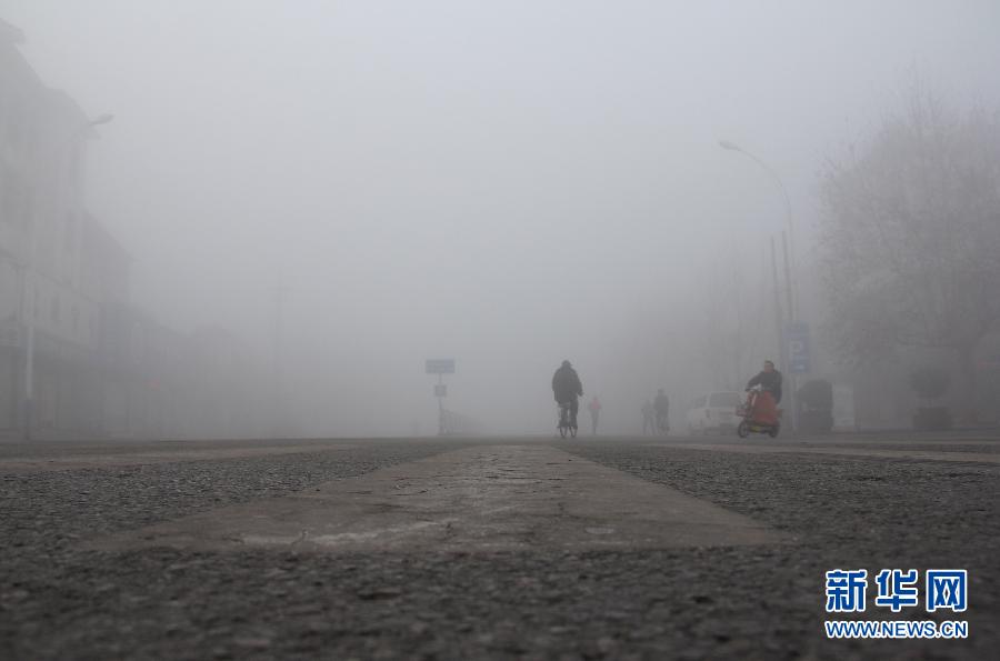 3月16日,在山东枣庄台儿庄兴中南路,市民在浓雾中出行。当日,山东省枣庄市部分地区出现能见度小于100米的平流雾,京杭大运河台儿庄段能见度小于50米。 新华社发(张严新 摄)