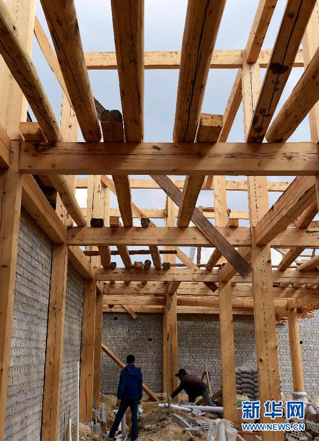 工人在云南香格里拉县独克宗古城修建房屋(3月14日摄)。目前,云南香格里拉独克宗古城恢复重建工作正在有序进行。按照古城恢复重建的总体规划,当地计划投入12.2亿元资金,在2016年之内完成全部重建工作。据了解,独克宗古城在重建过程中,将充分尊重历史、尊重民族文化、尊重民俗民风。截至3月14日,古城恢复重建区的电力、通信、消防、供排水等基础管网设施已大部分铺设完成,因灾无房居民的房屋重建及道路恢复工作已全面启动。具有1300多年历史的“月光城”独克宗古城在2014年1月11日遭遇火灾。新华社记者 蔺以光 摄