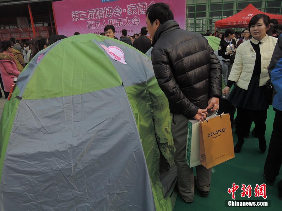 图为一男士在站在帐篷前看帐篷中女士的信息。韩章云 摄