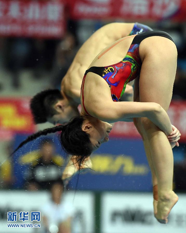 3月14日,陈艾森/何姿(前)在比赛中。当日,在2015年国际泳联(FINA)世界跳水系列赛北京站男女混合3米跳板决赛中,中国选手陈艾森/何姿以330.00分的成绩获得冠军。新华社记者公磊摄