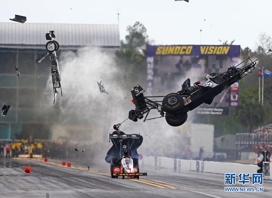 当日,在美国NHRA直线加速赛赛场,车手拉里·狄克逊驾驶的赛车在比赛中发生撞车事故,所幸车手在惨烈的事故后安然无恙。 NHRA(美国国家高速汽车协会)直线加速赛在二战后在美国兴起。该比赛由两辆赛车在约400米的赛道从静止加速到400公里/小时,加速最快的赛车获得胜利。该赛事是一种挑战速度极限的运动,深受爱车人士的追捧。新华社/路透