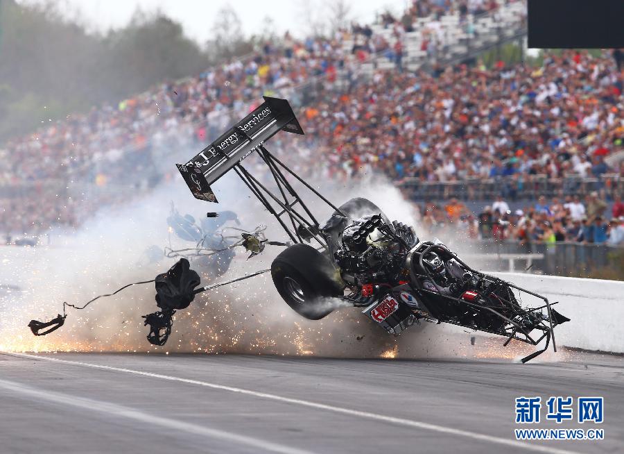 当日,在美国NHRA直线加速赛赛场,车手拉里·狄克逊驾驶的赛车在比赛中发生撞车事故,所幸车手在惨烈的事故后安然无恙。 NHRA(美国国家高速汽车协会)直线加速赛在二战后在美国兴起。该比赛由两辆赛车在约400米的赛道从静止加速到400公里/小时,加速最快的赛车获得胜利。该赛事是一种挑战速度极限的运动,深受爱车人士的追捧。新华社/路透