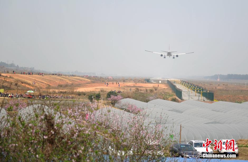 3月14日,成都上千民众赏花看飞机降落。中新社发 刘忠俊 摄