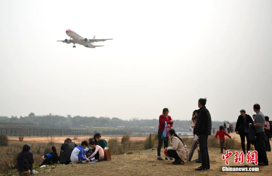3月14日,成都上千民众出门春游看飞机降落。中新社发 刘忠俊 摄
