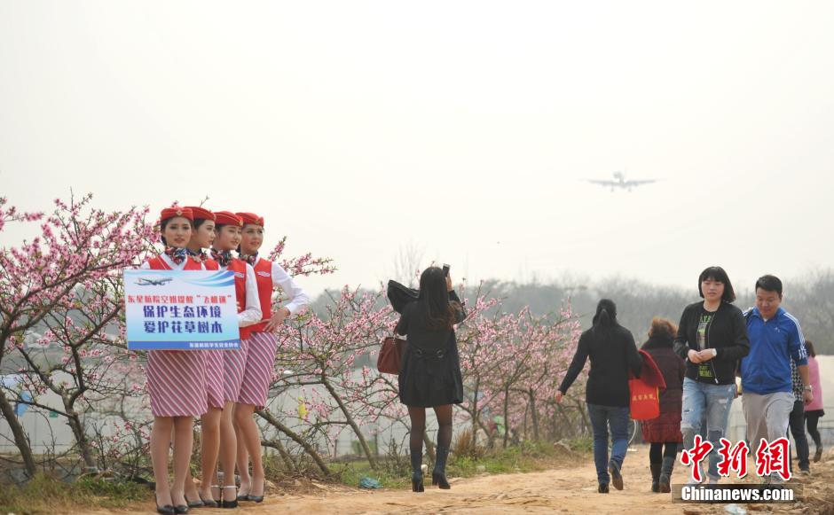 3月14日,成都民众赏桃花看飞机降落,准空姐现场提醒保护环境。中新社发 刘忠俊 摄