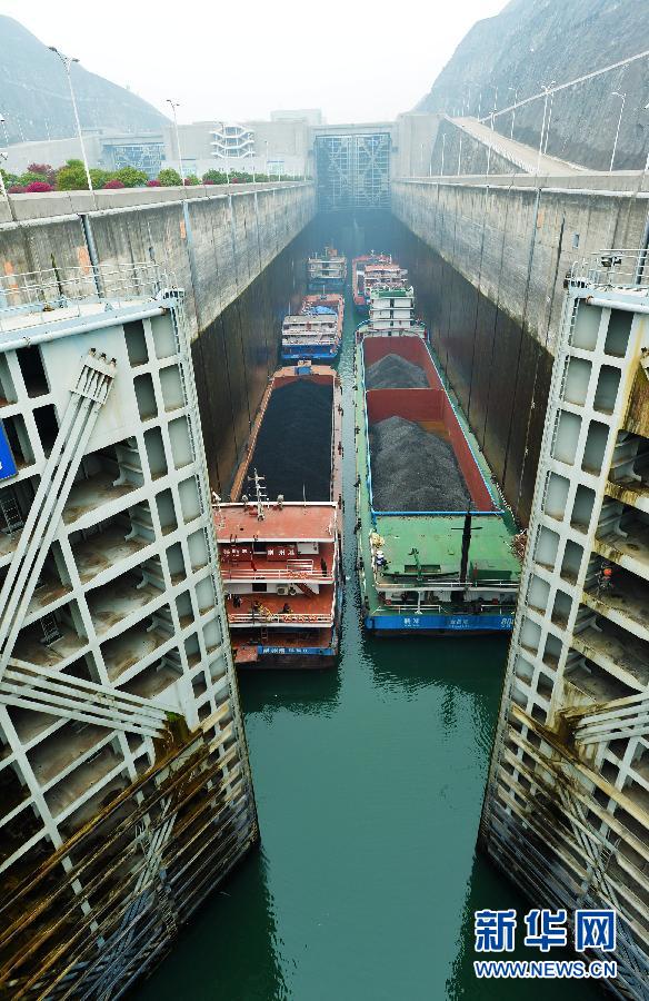 3月14日,船舶有序通过三峡北线船闸上行。中国长江三峡集团公司三峡枢纽建设运行管理局3月13日透露,三峡南线船闸2015年计划性停航检修施工任务已按计划完成,并通过了由业主、设计、监理、运行、施工等单位专家的联合验收。3月13日17时起,南线船闸开始充水,检修转入有水调试阶段,预计3月16日8时恢复通航。新华社发(郑家裕 摄)