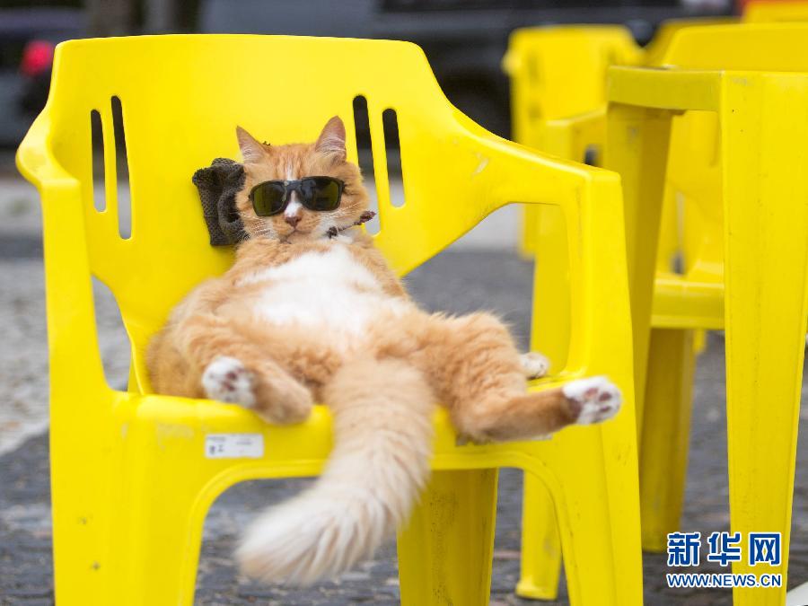 3月14日,在巴西里约热内卢,一只被主人装扮上太阳镜的猫在海边圈椅上晒太阳,酷似慵懒的“加菲猫”卡通形象。 新华社记者 徐子鉴 摄