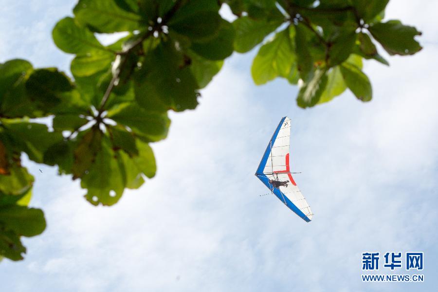 3月14日,在巴西里约热内卢,爱好者驾驶三角翼飞行。里约热内卢加维亚山上有一处名叫“美丽石”的地方,每天都聚集着众多三角翼和滑翔伞爱好者。他们从设置在“美丽石”的平台上起飞,冲入云端,享受自由翱翔的感觉,最后降落在山脚下的圣孔拉多海滩。新华社记者 徐子鉴 摄