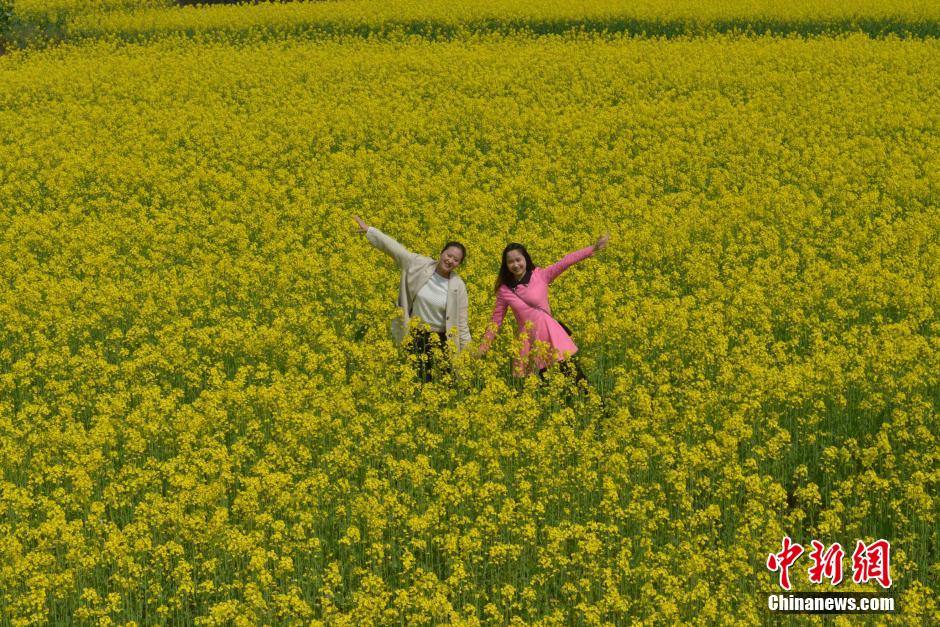 阳春三月,贵州省遵义市余庆县大乌江镇红渡村梯田中的油菜花竞相开放,层层叠叠的梯田形成一幅美丽的画卷,吸引了众多游客和摄影爱好者。图为3月14日,游客在油菜花中穿行。中新社发 贺春雨 摄