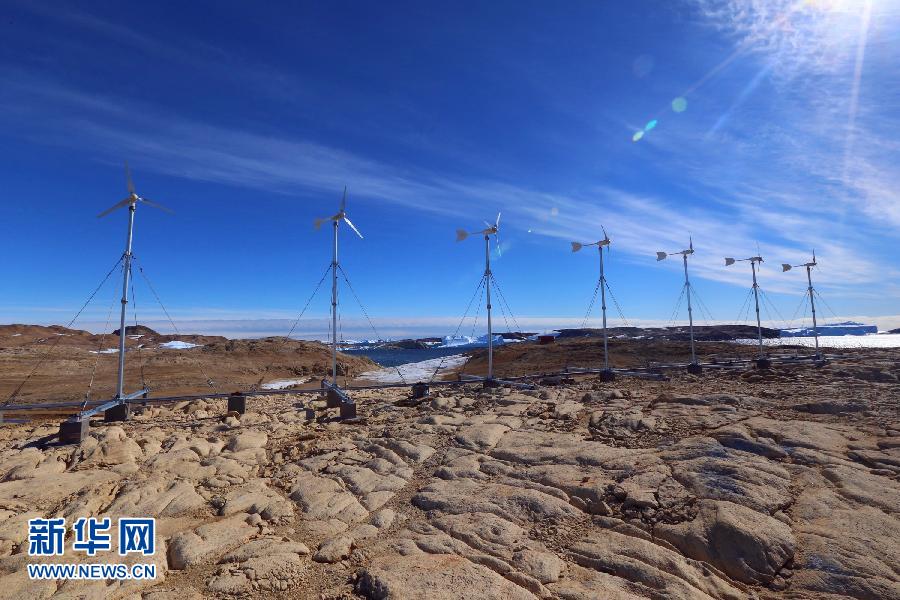 这是南极中山站站区“天鹅岭”上的风力发电机组(3月1日摄)。在中山站附近,一排随风转动的白色“大风车”格外引人注目。作为南极中山站可再生能源项目的一部分,这一组风力发电机在经过2年试运行后,于本次南极科考期间正式连续发电。新华社记者 白阳 摄