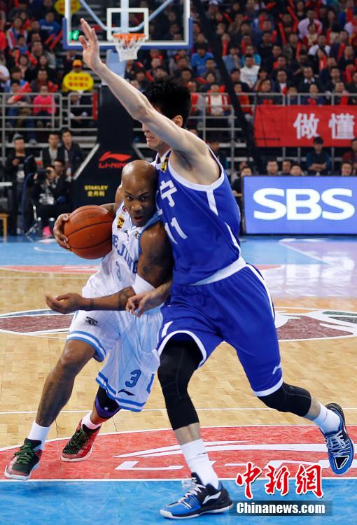 3月15日,2014-2015赛季中国男子篮球职业联赛(CBA)总决赛第三场的比赛中,北京首钢队主场以108比109负于辽宁药都本溪队。 中新社发 韩海丹 摄