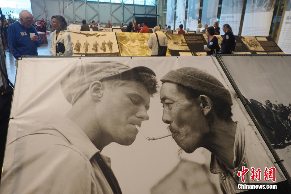 当地时间3月14日,展现二战时期中美盟军在中缅印战场共同抗战的《国家记忆》图片展在美国夏威夷珍珠港太平洋航空博物馆隆重开幕。展览展出了二战期间美国通信兵团164照相连拍摄的一百多幅珍贵历史图片。现场墙壁上悬挂着超过12米高的巨幅照片与地面陈列的当年“飞虎队”驾驶过的P-40战机带给人震撼的视觉效果。中新社发 毛建军 摄