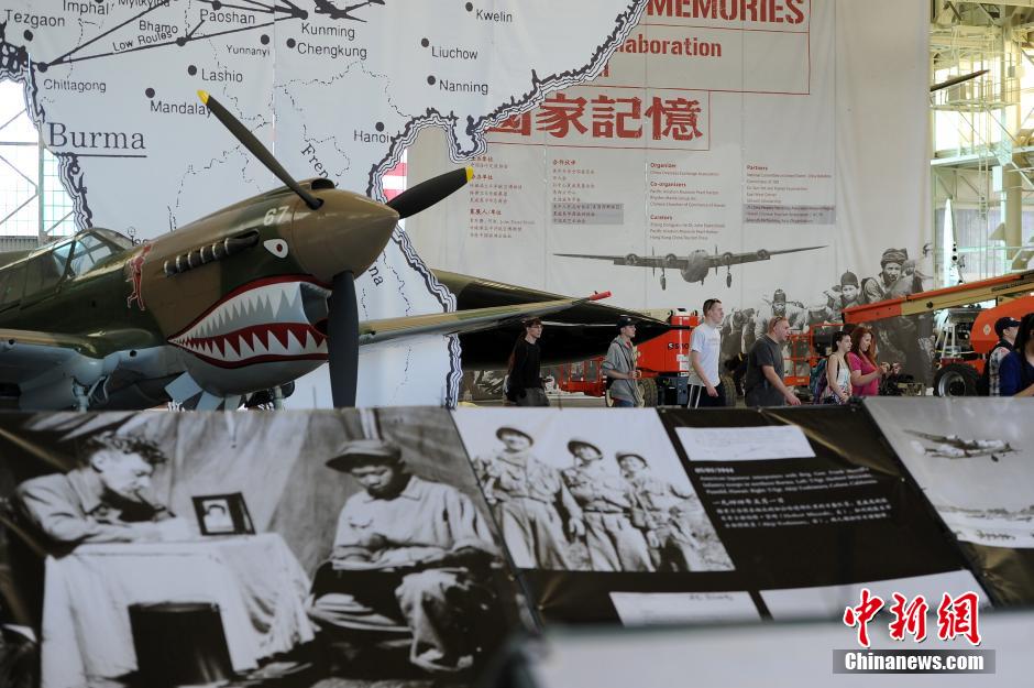 当地时间3月14日,展现二战时期中美盟军在中缅印战场共同抗战的《国家记忆》图片展在美国夏威夷珍珠港太平洋航空博物馆隆重开幕。展览展出了二战期间美国通信兵团164照相连拍摄的一百多幅珍贵历史图片。现场墙壁上悬挂着超过12米高的巨幅照片与地面陈列的当年“飞虎队”驾驶过的P-40战机带给人震撼的视觉效果。中新社发 毛建军 摄