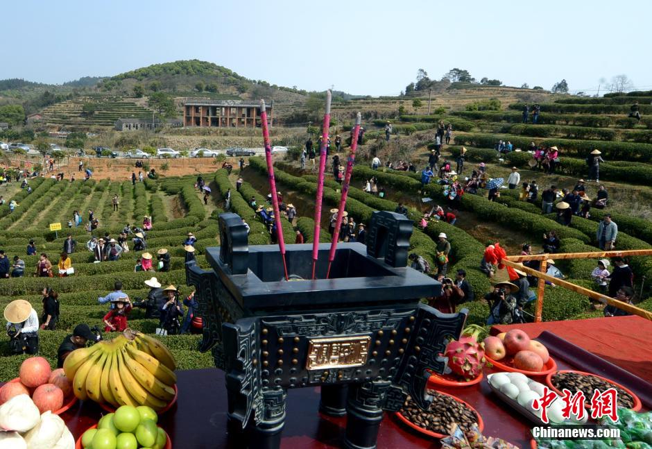 3月15日,榕城春光明媚。当日,福州春伦休闲农业观光园近千亩生态茶园内,锣鼓喧天、鞭炮齐鸣,正在此间举行的海丝春伦.扬帆起航“2015年春伦集团开春第一采”活动现场,重现传统祈福祭茶仪式,吸引众多民众前来观看、体验。该祈福祭茶仪式上,担任主祭、陪祭的嘉宾行献香礼并三鞠躬,一敬天,再敬地、三敬茶山;在众人齐诵“季节吉日正当时,茗邀四海传天下……”的喊茶诗声中将活动带向高潮。福州作为世界茉莉花茶的发源地,茶文化积淀深厚。福州春伦休闲农业观光园近千亩生态茶园举行祈福祭茶仪式,开启“开春第一采”活动帷幕。刘可耕 摄