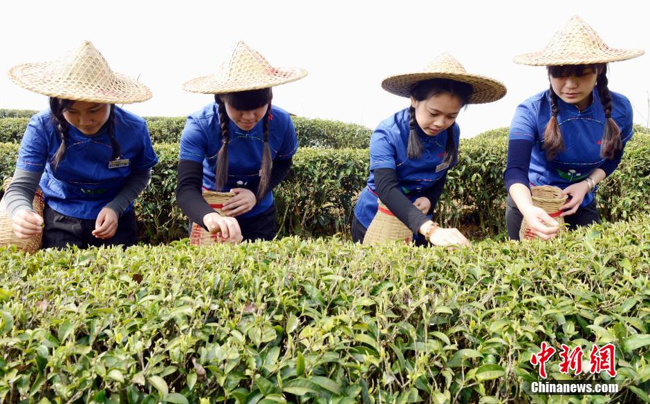 4位采茶姑娘在福州春伦休闲农业观光园近千亩生态茶园采茶忙。刘可耕 摄
