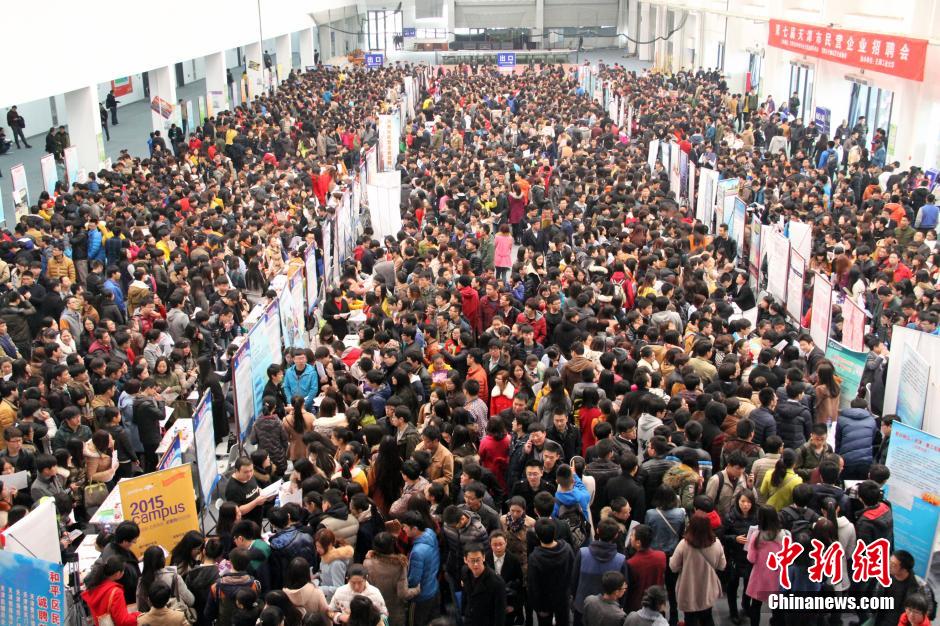 3月14日,由天津市大中专毕业生就业指导中心、天津市个体民营企业协会联合主办的“第七届天津市民营企业招聘会”在天津工业大学健身馆举办,近万名大学生前来应聘,几乎将整个场馆“挤爆”。本次招聘会是天津市毕业生就业指导中心为2015届毕业生举办的第五场公益性招聘会,参会单位超过130家,共计为毕业生提供就业岗位约1800个,近八成岗位面向本科和高职(专科)毕业生。中新社发 张道正 摄