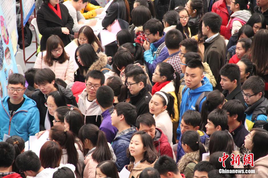 3月14日,由天津市大中专毕业生就业指导中心、天津市个体民营企业协会联合主办的“第七届天津市民营企业招聘会”在天津工业大学健身馆举办,近万名大学生前来应聘,几乎将整个场馆“挤爆”。本次招聘会是天津市毕业生就业指导中心为2015届毕业生举办的第五场公益性招聘会,参会单位超过130家,共计为毕业生提供就业岗位约1800个,近八成岗位面向本科和高职(专科)毕业生。中新社发 张道正 摄