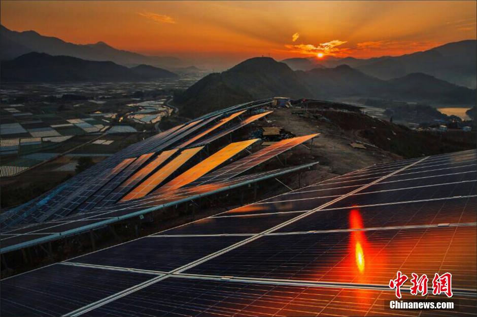 3月13日,福建省最大容量的光伏发电站——信义太阳能光伏发电站正式并网发电。 据南平供电公司介绍,信义太阳能光伏发电站位于南平市松溪县,是福建首座容量最大、纯光伏发电的地面光伏发电站,总投资规模约9亿元,全站面积1.11万平方米,总计安装22万块多晶硅太阳能电池板,建设总容量为50兆瓦,一年约可发电6640万千瓦时,占松溪全县小水电发电总量的三分之二,可持续运营25年。图为夕阳照射下的光伏电板。 中新社发 陈书忠 摄