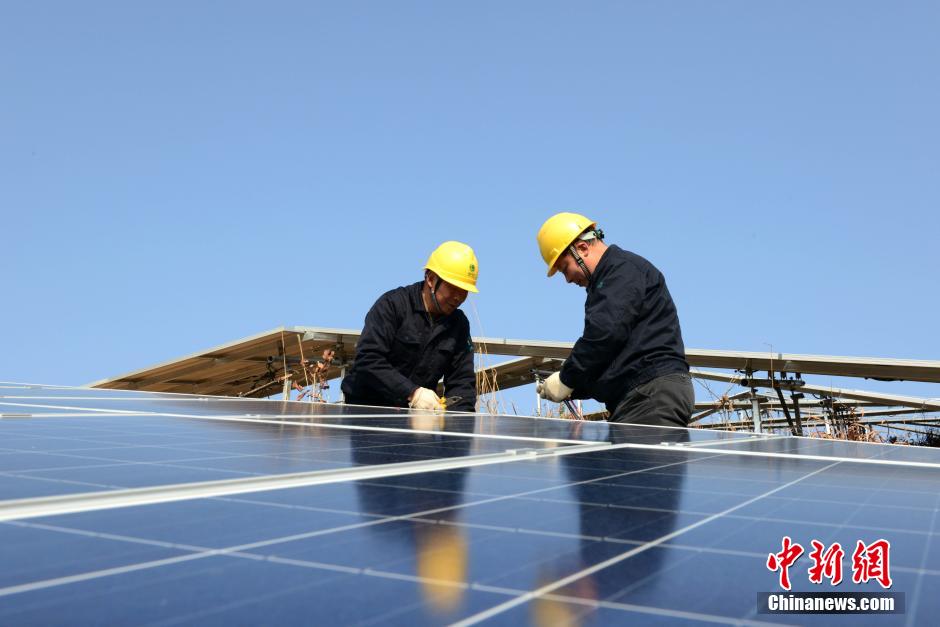 3月13日,福建省最大容量的光伏发电站——信义太阳能光伏发电站正式并网发电。图为电力工人在检查线路。 中新社发 陈书忠 摄