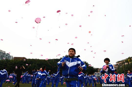 学生们集体放飞成都印象号中华飞伞。钟欣 摄
