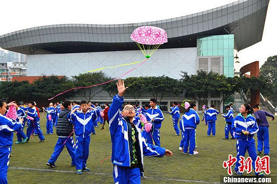 3月13日下午,成都华西中学体育场举行了一堂场面生动的体育活动课,三百多名学生一起抛起手中的小型降落伞,几百只小降落伞在天空中美丽地飞翔,形成了一道壮丽的景观。放飞的小降落伞,是河北承德人张雄舰发明的中华飞伞中的一款“成都印象”号,这次张雄舰专程来到华西中学不仅向学校捐赠了一批“成都印象”号中华飞伞供学生上体育活动课使用,而且还亲自来为学生当教练指导学生们正确使用中华飞伞,亲自为学生上了这堂精彩的体育活动课。活动课上,张雄舰还高抛世界最大号的直径达一米六的大飞伞。