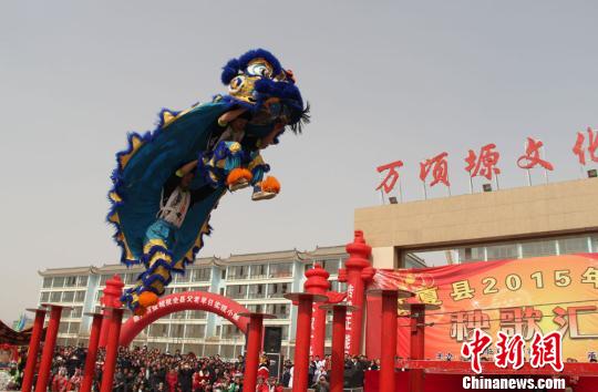 3月3日,农历正月十三,甘肃少数民族县临夏县4支庆新春秧歌队在该县土桥镇万顷塬文化广场进行秧歌汇演,迎接“脚步”渐近的羊年元宵节。图为舞狮走桩表演。 居永龙 摄