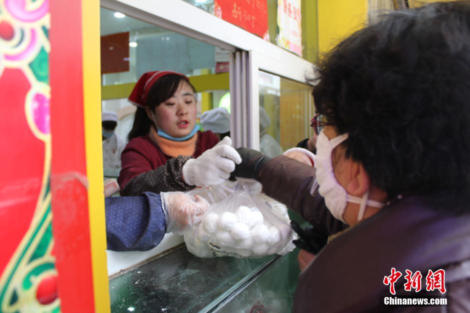 3月4日,兰州几家老字号甜食店门前一大早便排起蜿蜒曲折的数百米长龙,为了全家能吃上寓意“团圆”的元宵,不少老人“全副武装”坚守在寒风中。徐雪 摄