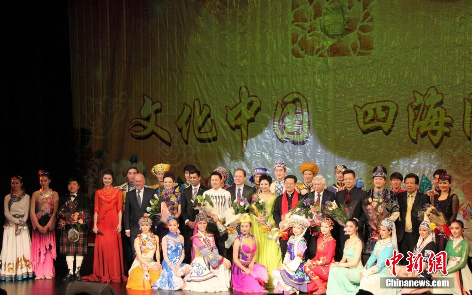 图为艺术团团长、国务院侨办宣传司司长许玉明和当地政要、侨领等一起祝贺演出成功。中新社发 周兆军 摄