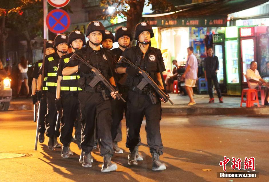 3月3日晚,海南省三亚市公安局特警(防暴)支队队员在三亚商品街武装巡逻。 中新社发 尹海明 摄