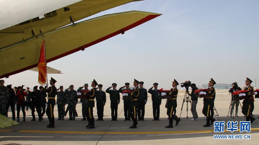 3月20日,在韩国仁川国际机场,中方礼兵将中国人民志愿军烈士遗骸护送上飞机。当日,中韩双方在韩国仁川机场再次对2014年发掘确认的志愿军烈士遗骸进行交接。根据中韩双方达成的共识,对在韩国发掘的中国人民志愿军烈士遗骸,每年清明节前协商交接。2014年3月28日,中韩双方曾举行了在韩中国人民志愿军烈士遗骸首次交接仪式。新华社记者姚琪琳摄