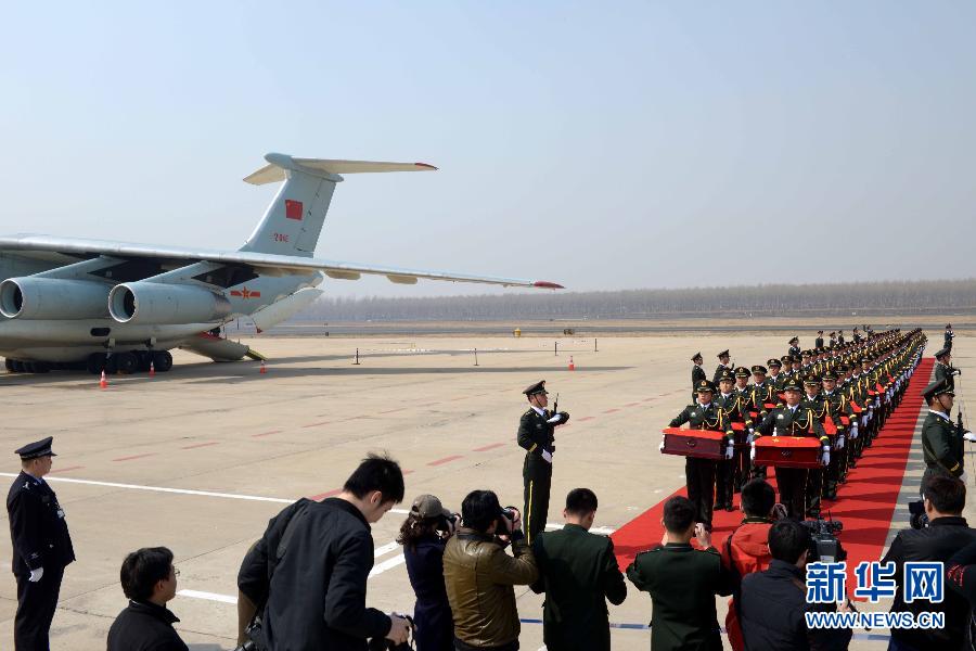 3月20日,运送68位中国人民志愿军烈士的遗骸的中国空军大型运输机回到沈阳桃仙国际机场。当日,中韩双方在韩国仁川机场再次对2014年发掘确认的志愿军烈士遗骸进行交接。根据中韩双方达成的共识,对在韩国发掘的中国人民志愿军烈士遗骸,每年清明节前协商交接。2014年3月28日,中韩双方曾举行了在韩中国人民志愿军烈士遗骸首次交接仪式。新华社发(沈玲 摄)