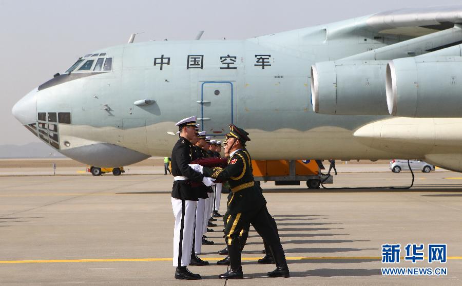 3月20日,在韩国仁川国际机场,韩方向中方礼兵(右)交接中国人民志愿军烈士遗骸。当日,中韩双方在韩国仁川机场再次对2014年发掘确认的志愿军烈士遗骸进行交接。根据中韩双方达成的共识,对在韩国发掘的中国人民志愿军烈士遗骸,每年清明节前协商交接。2014年3月28日,中韩双方曾举行了在韩中国人民志愿军烈士遗骸首次交接仪式。新华社记者姚琪琳摄