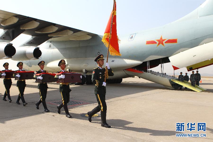 3月20日,在韩国仁川国际机场,中方礼兵移送中国人民志愿军烈士遗骸棺椁。当日,中韩双方在韩国仁川机场再次对2014年发掘确认的志愿军烈士遗骸进行交接。根据中韩双方达成的共识,对在韩国发掘的中国人民志愿军烈士遗骸,每年清明节前协商交接。2014年3月28日,中韩双方曾举行了在韩中国人民志愿军烈士遗骸首次交接仪式。新华社记者姚琪琳摄