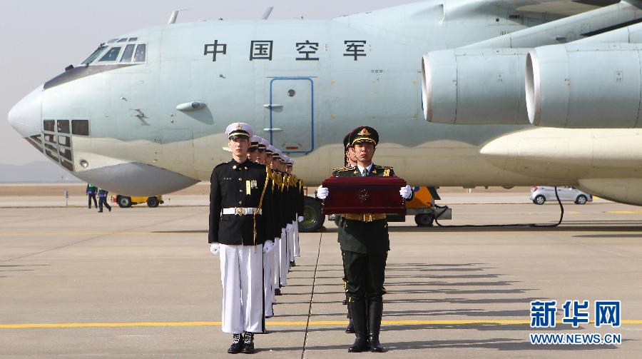 3月20日,在韩国仁川国际机场,中方礼兵(右)怀抱中国人民志愿军烈士遗骸棺椁。当日,中韩双方在韩国仁川机场再次对2014年发掘确认的志愿军烈士遗骸进行交接。根据中韩双方达成的共识,对在韩国发掘的中国人民志愿军烈士遗骸,每年清明节前协商交接。2014年3月28日,中韩双方曾举行了在韩中国人民志愿军烈士遗骸首次交接仪式。新华社记者姚琪琳摄