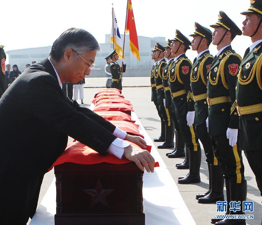 3月20日,在韩国仁川国际机场,中国驻韩大使邱国洪(前左)为中国人民志愿军烈士遗骸棺椁覆盖中国国旗。当日,中韩双方在韩国仁川机场再次对2014年发掘确认的志愿军烈士遗骸进行交接。根据中韩双方达成的共识,对在韩国发掘的中国人民志愿军烈士遗骸,每年清明节前协商交接。2014年3月28日,中韩双方曾举行了在韩中国人民志愿军烈士遗骸首次交接仪式。新华社记者姚琪琳摄
