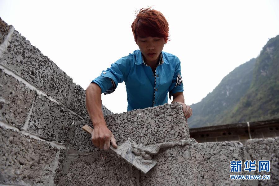 3月2日,在板升乡弄顶屯,蒙宣友在帮叔叔建房子。新华社记者 张爱林 摄