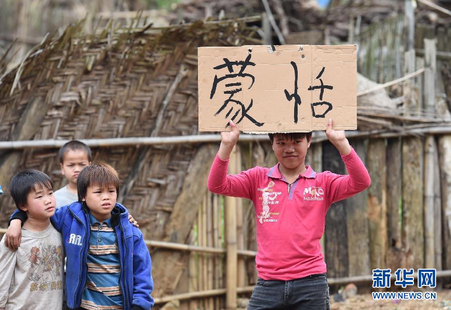 2月19日,在板升乡弄顶屯春晚现场,一名男孩手举写有蒙宣友艺名的牌子。新华社记者 黄孝邦 摄