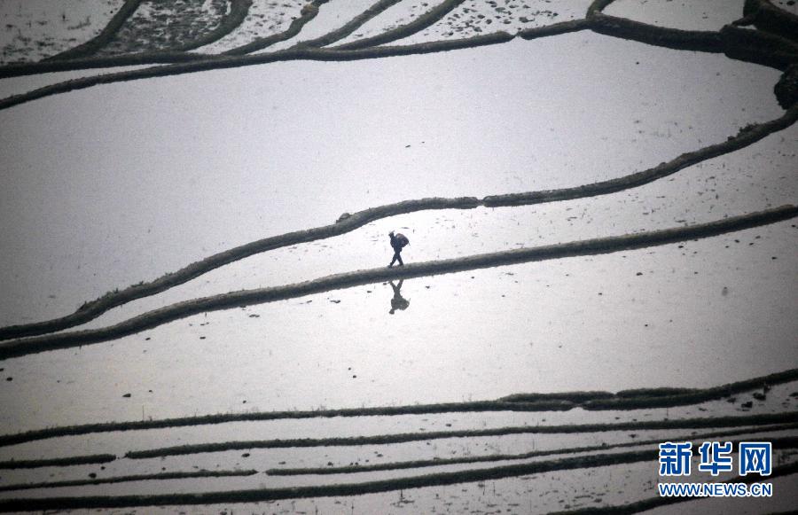 3月22日,一名农民走在云南元阳的梯田上。三月春暖,云南元阳梯田蓄水渐满,开始了春耕的准备。 新华社发(梁志强 摄)
